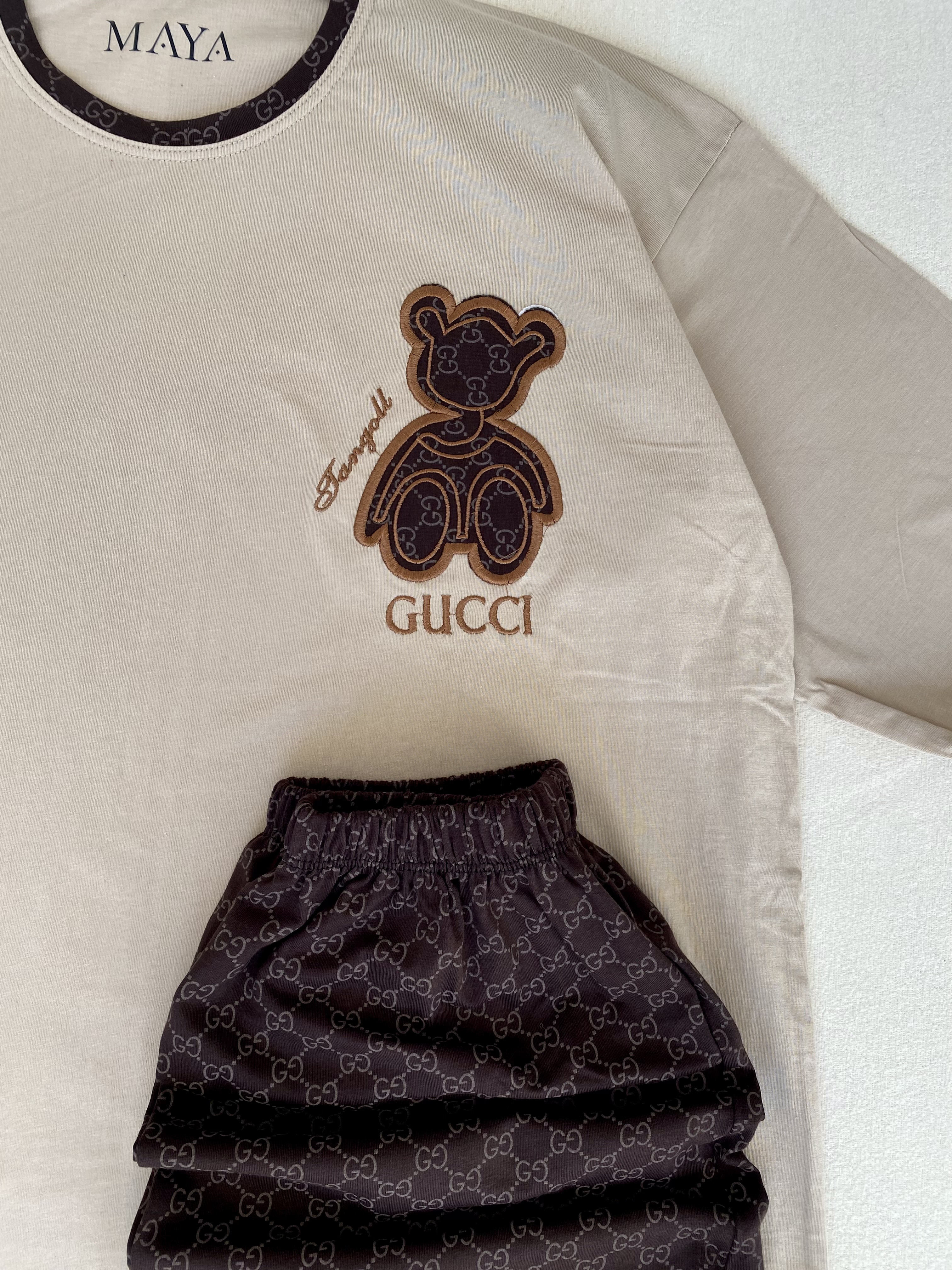 ✔️مدل تیشرت باکسی ،آستین سه ربع هستش و از جنس نخپنبه درجه یک و طرح Gucci گلدوزی شده ✔️مدل شلوار دمپا راسته ، مرغکدار و از جنس پنبه لایکرا 📸 همه تصاویر اختصاصی مایا شاپ هستن – ژورنالی نیستن! ──── ୨ৎ MAYA SHOP ୨ৎ────
